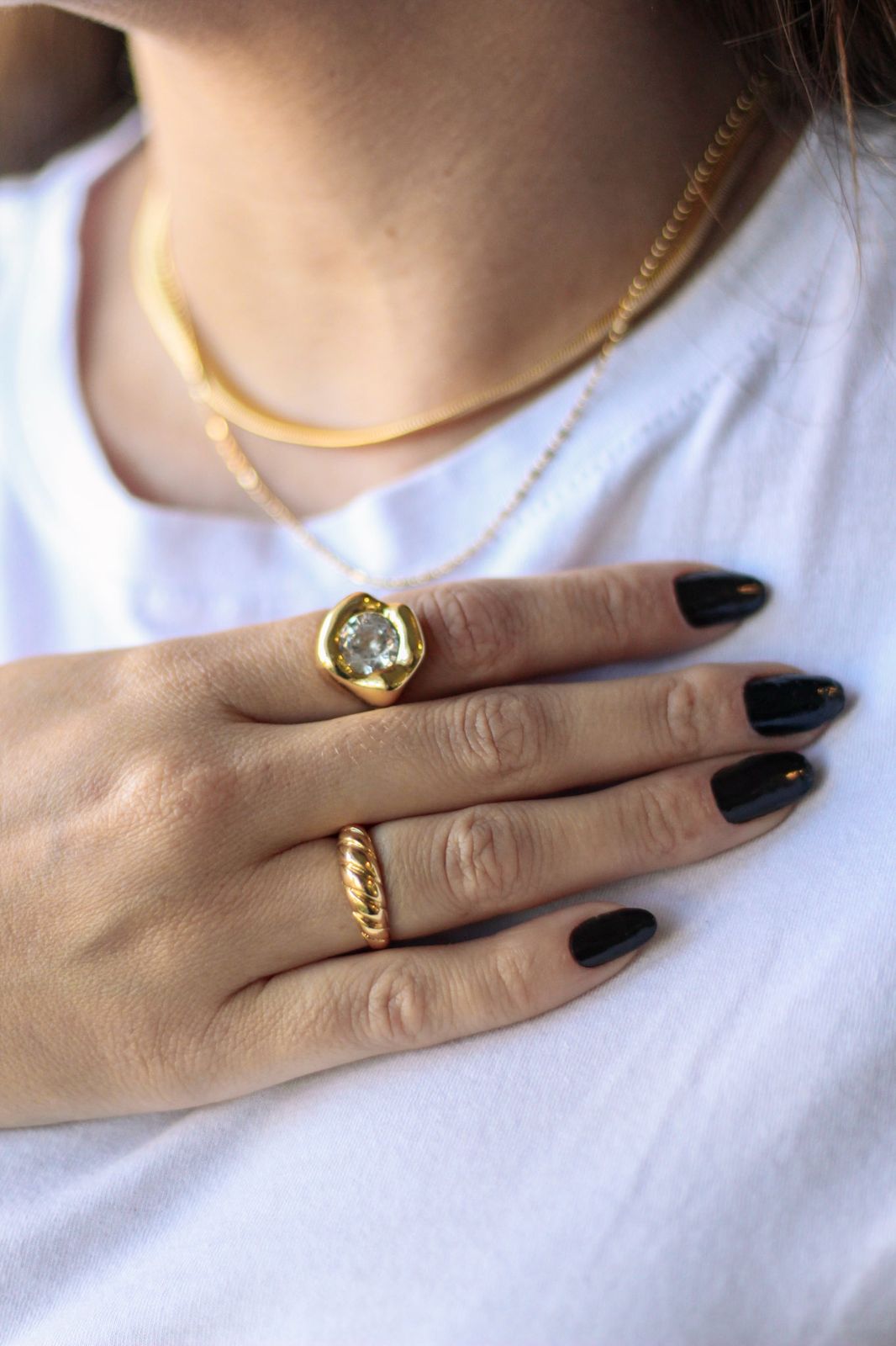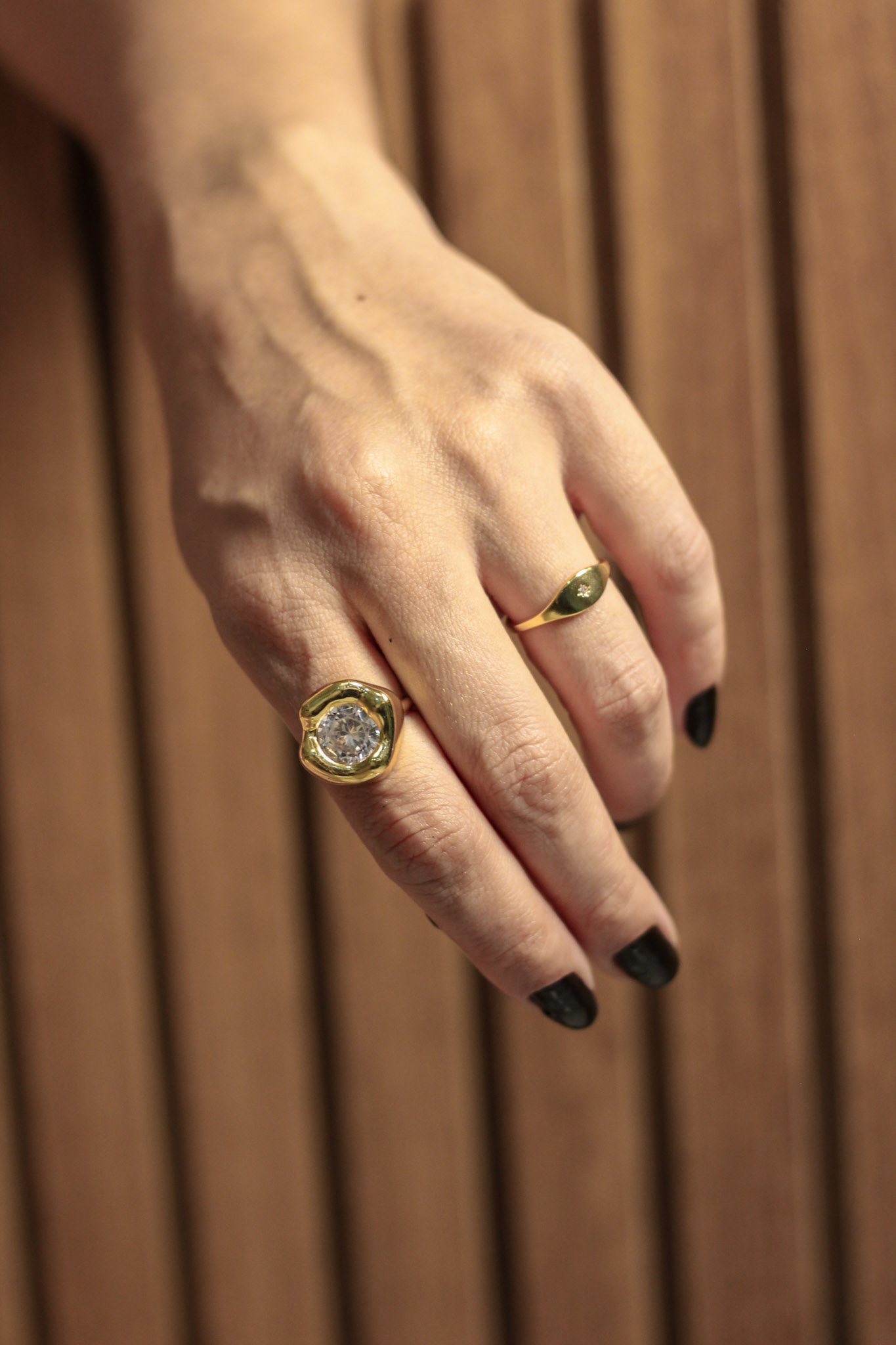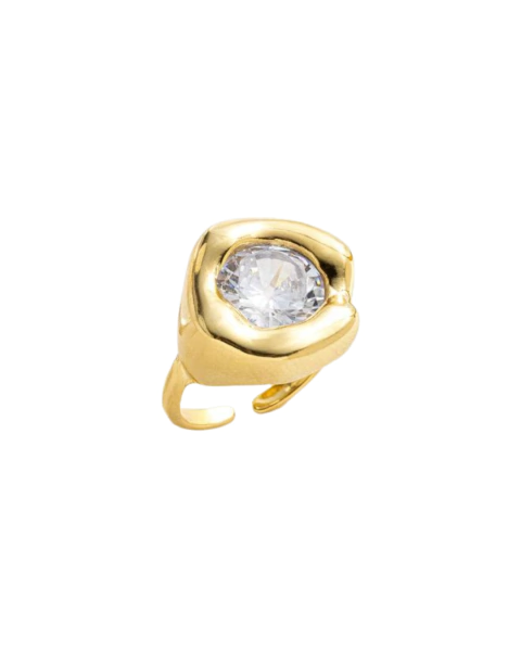 Sofisticado e marcante, este anel apresenta design orgânico com acabamento abaulado que valoriza ainda mais sua pedra central em zircônia. O brilho intenso da pedra contrasta com o dourado polido, criando uma peça elegante e atemporal.