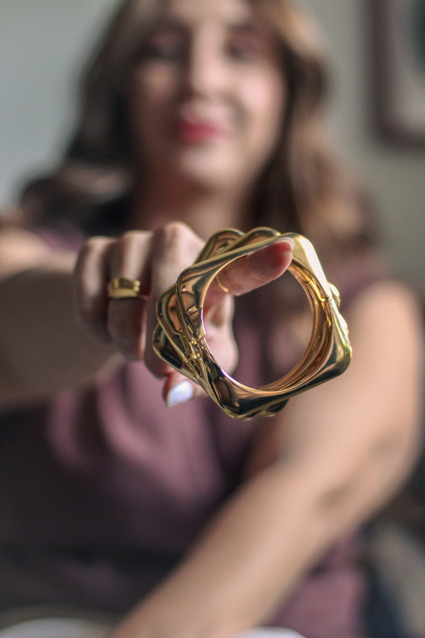 O banho em ouro 18k realça o brilho e a sofisticação do bracelete, enquanto o design estruturado garante personalidade sem perder a versatilidade.