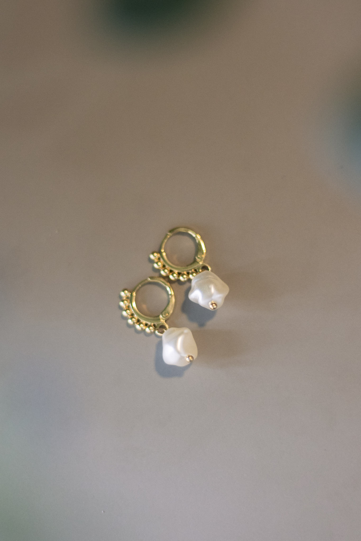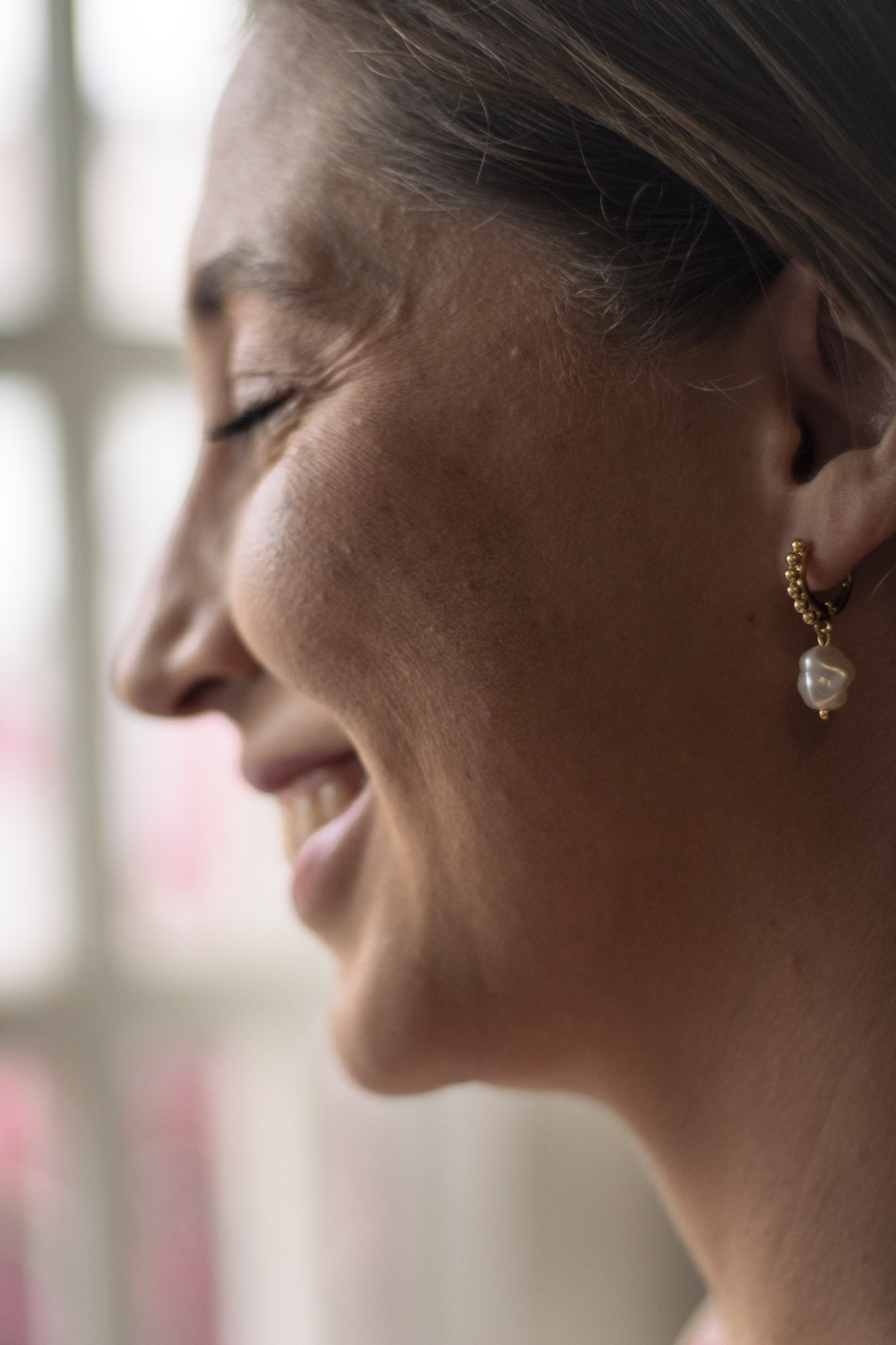 Design romântico e delicado, com pingentes em pérolas irregulares e pequenas esferas que criam movimento e leveza. Uma peça sofisticada e atemporal, banhado a Ouro 18k